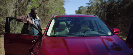Red and blue can represent various things, but in the case of Get Out I argue that there are specific meanings connected to these colors that are unique for this film. The fact that the colors are repeatedly used in combination is relevant when the colors are associated with political color, colors that (un)officially represent American political parties. Red represents the Republican Party and conservative states while blue represents the Democratic Party and liberal states. This political opposition plays a big role in Americanrace relations: generally, the Republican Party votes against affirmative action for racial minorities and pleads for stronger border controls and severe immigration limits; the Democratic Party is generally more sympathetic towards racial minorities and pleads for an open immigration policy. The political opposition that the colors red and blue represent in Get Out is recognizable throughout the entire film. The red color of the car represents the republican ideology, while Chris’ blue clothes represents the democratic one. The red car (figure 2) is dangerous to Chris: the vehicle brings him to a place where he is no longer safe (the Armitage residence), just like how the Republican Party could be dangerous for racial minorities.
