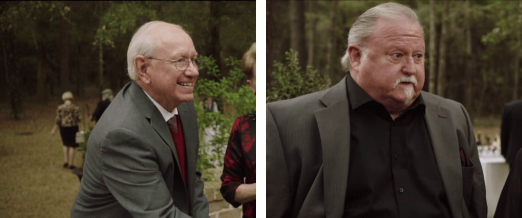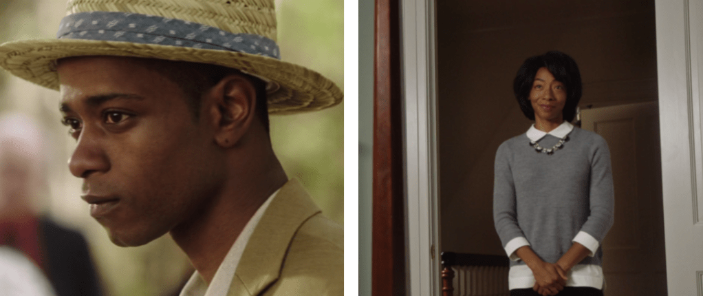 Walter (Marcus Henderson) is the groundskeeper in the film. He is dressed in mostly greens and browns to blend in with the grass and trees he so often finds himself in. Walter is dressed in a brown shirt, green jacket, green trousers and he wears a green hat (see figure 1). Considering the idea that the house of the Armitages is situated in the middle of a forest-like area, Walters colors form a palette which blends with the background. Consequently, Walter is made invisible, which could refer to a colorblind ideology: colorblindness supports and justifies the maintaining of racial inequality because it invisibilizes discourses of race and racism, which causes for the exclusion and invisibility of racial minorities. This is literally what is happening to Walter: the colors of his clothes make him disappear into the background. Throughout the entire film, he is represented as invisible.