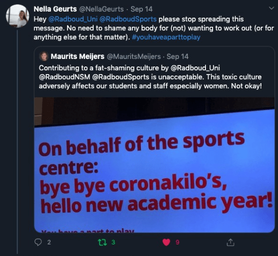Op het sportcentrum hing het afgelopen jaar een banner van Radboud met de tekst: ‘On behalf of the sports centre: bye bye coronakilo’s, hello new academic year!’. Had Nella Geurts (sociologie PHD kandidaat) niet opgemerkt dat dit het verspreiden van fatshaming is, dan was het mij niet eens opgevallen. Want waarom moet je gaan sporten? Het is oké om wat zwaarder te zijn. Zo genormaliseerd is fatshaming dus, als zelfs een instelling als Radboud er per ongeluk aan meedoet. Het is interessant om dit onderwerp een keer vanuit een, onder andere, wetenschappelijk perspectief te bekijken.