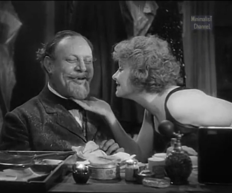 The story set in the Weimar Republic portrays a bourgeois tragedy, with Professor Rath embodying the era’s moral and social dilemmas (Smith 54). The Professor undergoes a transformation, seeing his name evolve from “Rath” resembling “Rat” (“advice”) to “Unrat” (“filth”), reflecting his moral decay and loss of societal respectability. He performs authority in the classroom, while in the presence of Lola, he turns into a sensible, soft-spoken man (fig. 2). This “feminization” of the Professor correlates with his loss of social power. Additionally, he regresses to childlike behaviour, hugging a doll in Lola’s bed after a night of drinking. McCormick describes how economic, social, and political changes during the Weimar period triggered a perceived threat to the bourgeois stability, an anxiety often projected on women (645). Lola, as the assertive, “masculine”, counterpart, is later blamed for the Professor’s downfall.