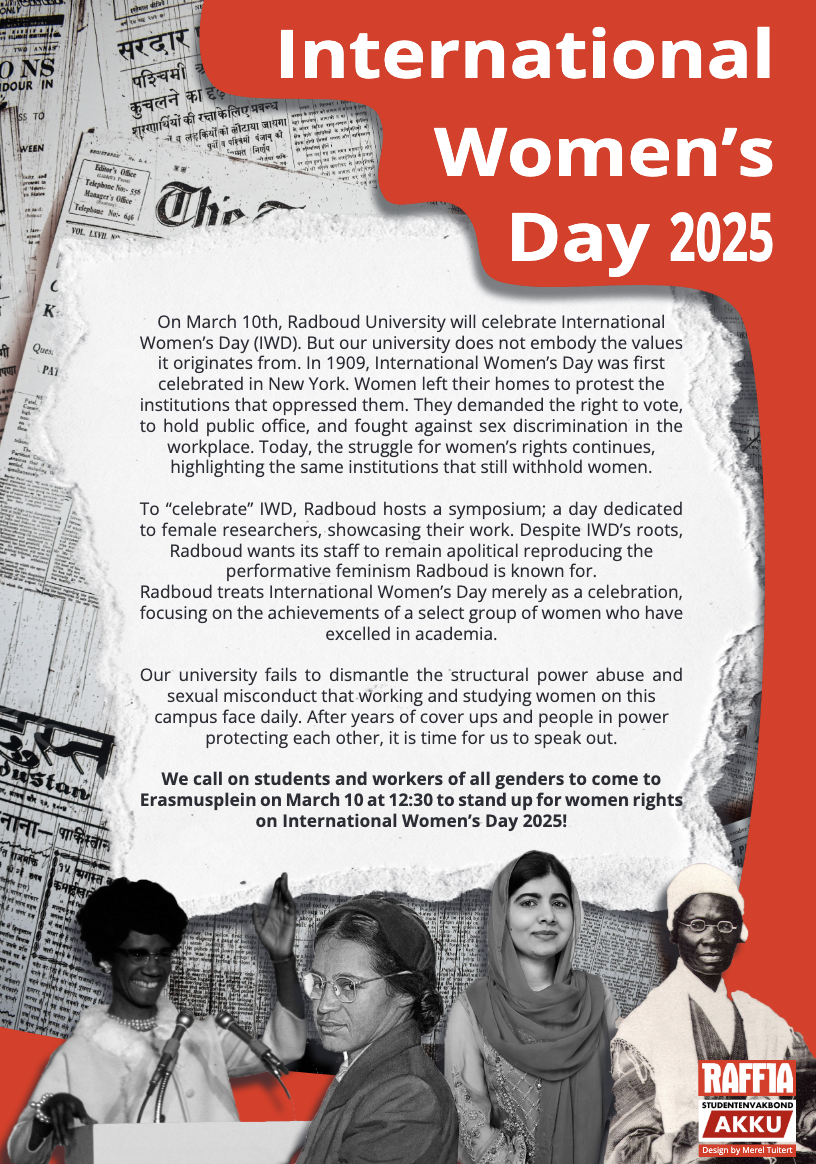 International Women’s Day should not be a convenient platform for corporate branding: it must be an opportunity to commit to transformative justice and systemic reform. Celebrating women’s achievements without confronting the power structures that hinder them is hypocritical and performative at best. Only when Radboud University actively dismantles the systemic barriers within its own institution, holds perpetrators of misconduct accountable, and cuts ties with entities complicit in human rights abuses, can it rightfully claim to stand for justice and equality – not just on International Women’s Day, but every day of the year.