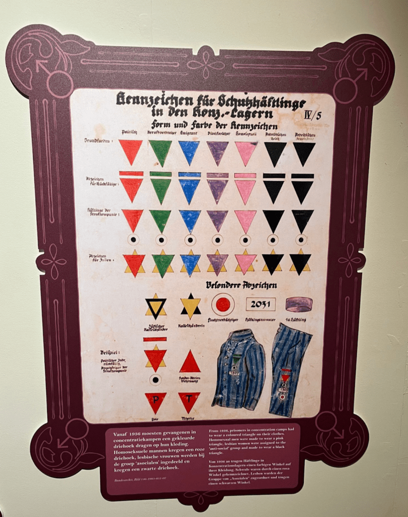 The Freedom Museum also takes this opportunity to highlight LGBTQI+ relationships during World War Two. Queer people have always existed and this showcases how their relationships were also affected during the war. German LGBTQI+ were one of the minority groups who were targeted by Nazi soldiers and who were shipped to and terminated in concentration camps. Many will be familiar with the Star of David that Jewish people were forced to wear that enabled public discrimination and surveillance all throughout the Nazi occupied Europe. Queer people were branded with a pink triangle to showcase their queerness to others. As the image below demonstrates, all people who were sent to concentration camps were branded based on their identity. The pink triangle has since been rebranded as a positive symbol for self-identity within LGBTQI+ communities.